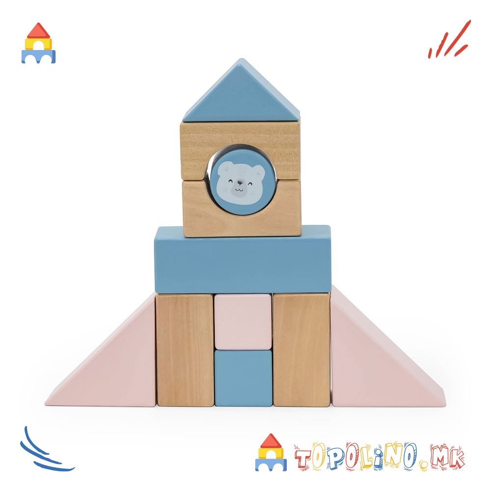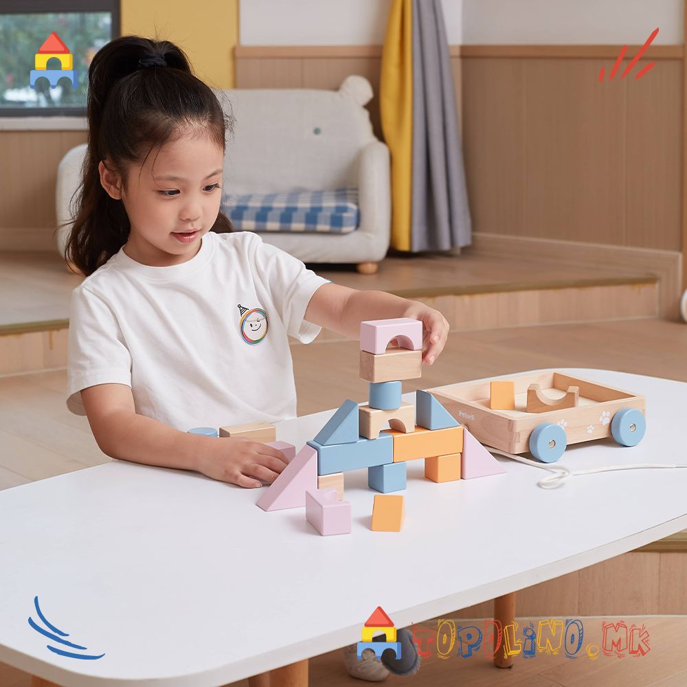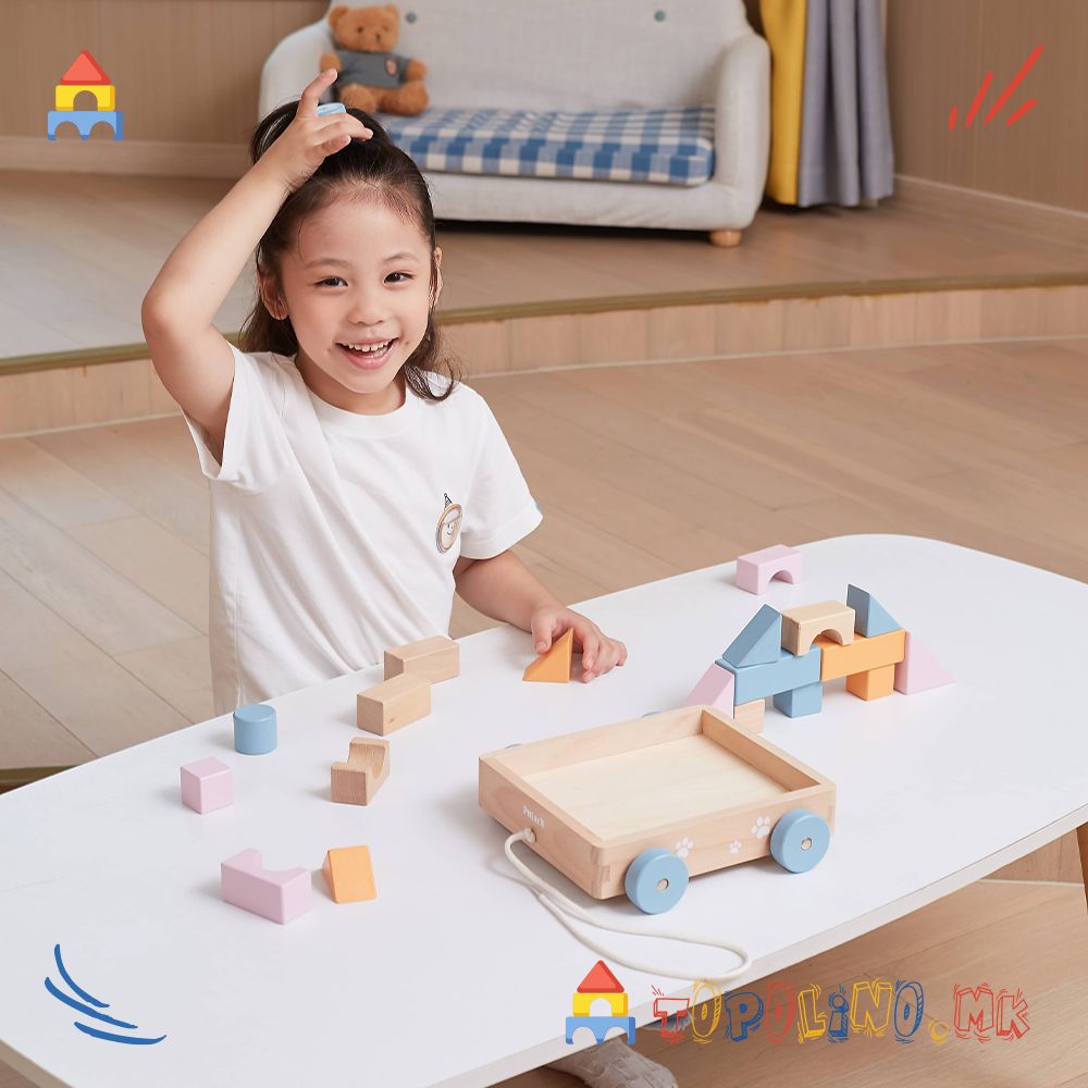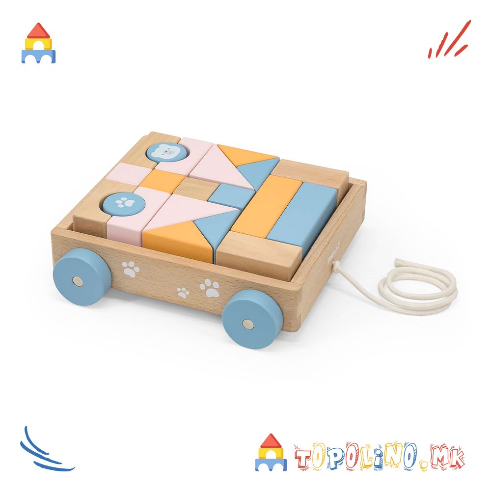 Оваа преслатка дрвена количка со коцки е совршена за мали истражувачи! Децата ќе ја обожаваат – ќе ја влечат насекаде и ќе уживаат во градење и редење со шарените дрвени блокчиња.