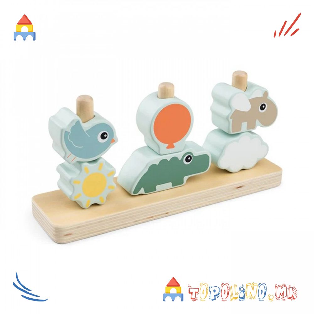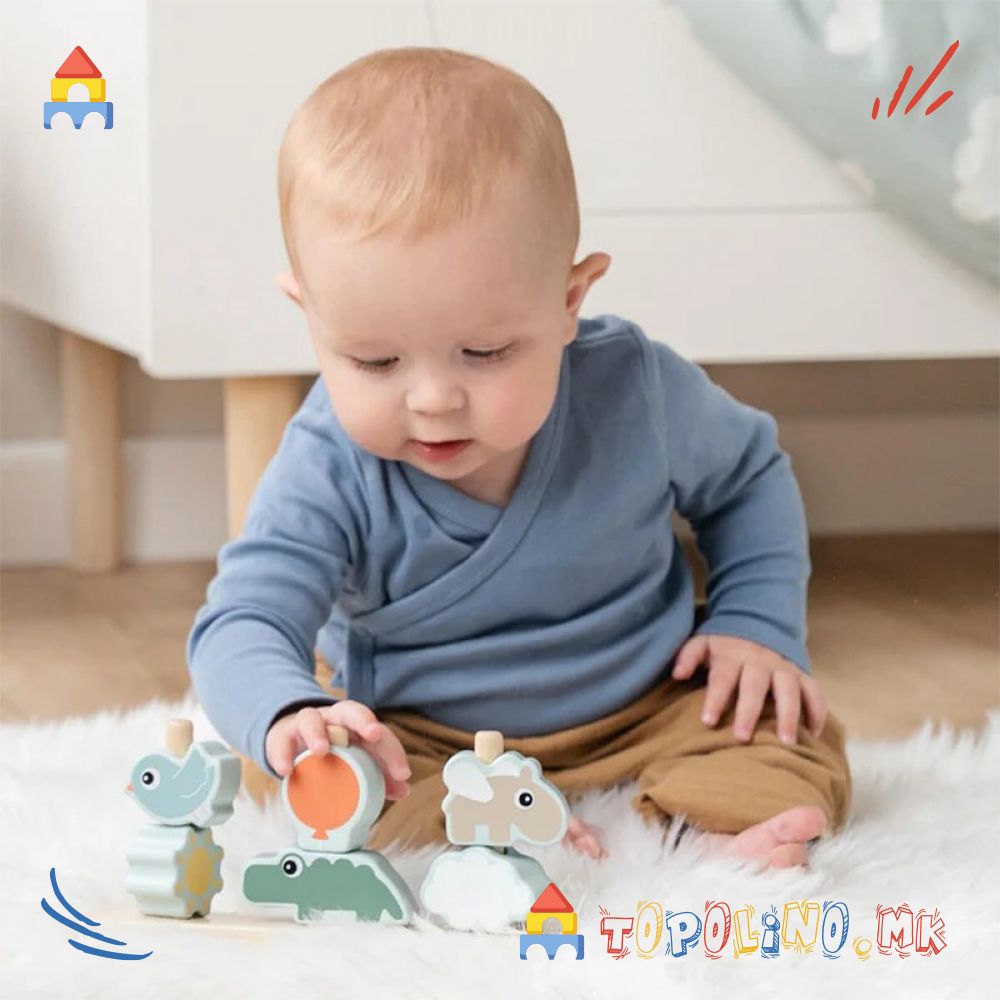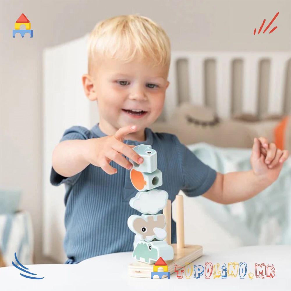 Изработена е од одговорно набавено дрво и обоена со безбедна, водена боја – за сигурна и безгрижна игра на вашето дете. Поддржете го развојното патување на најмалите со оваа весела играчка за редење.