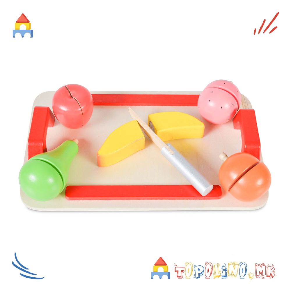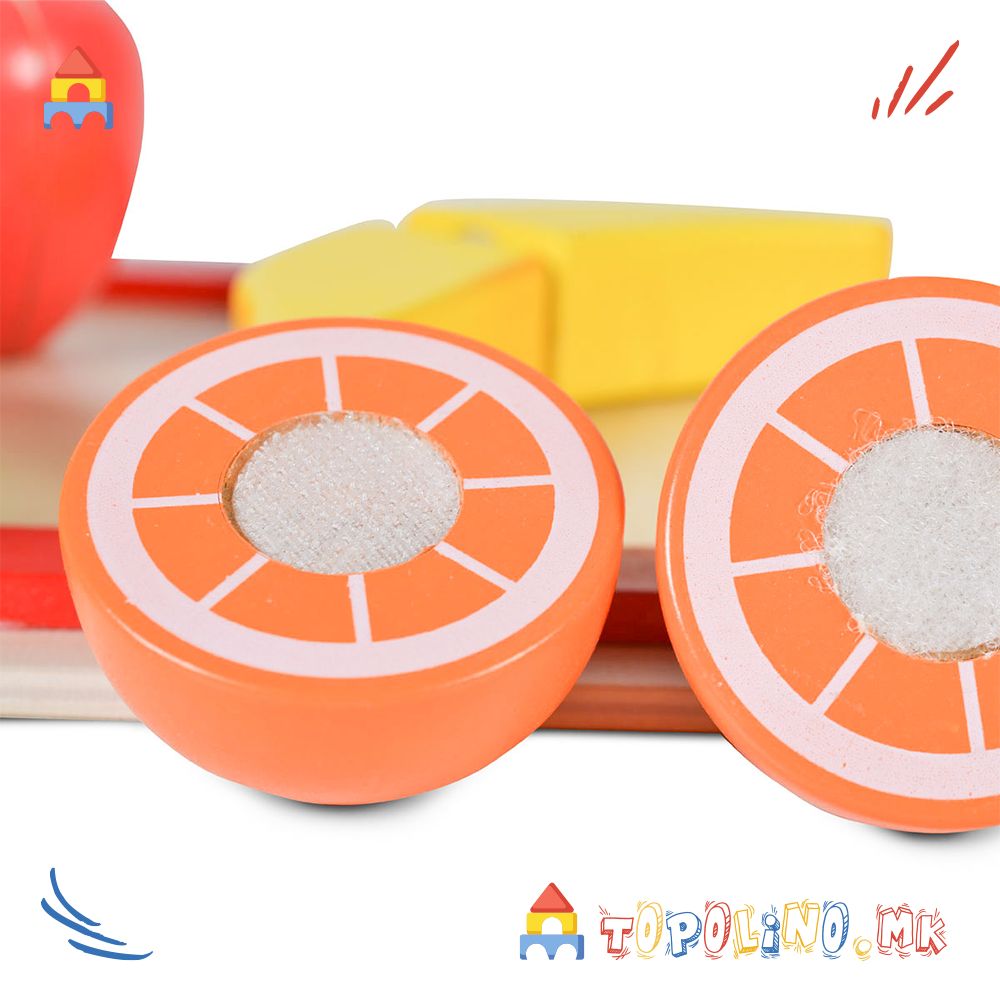 Сетот за сечење вклучува неколку дрвени делови: даска за сечење, нож и 5 овошја (јаболко, јагода, портокал, банана и круша).