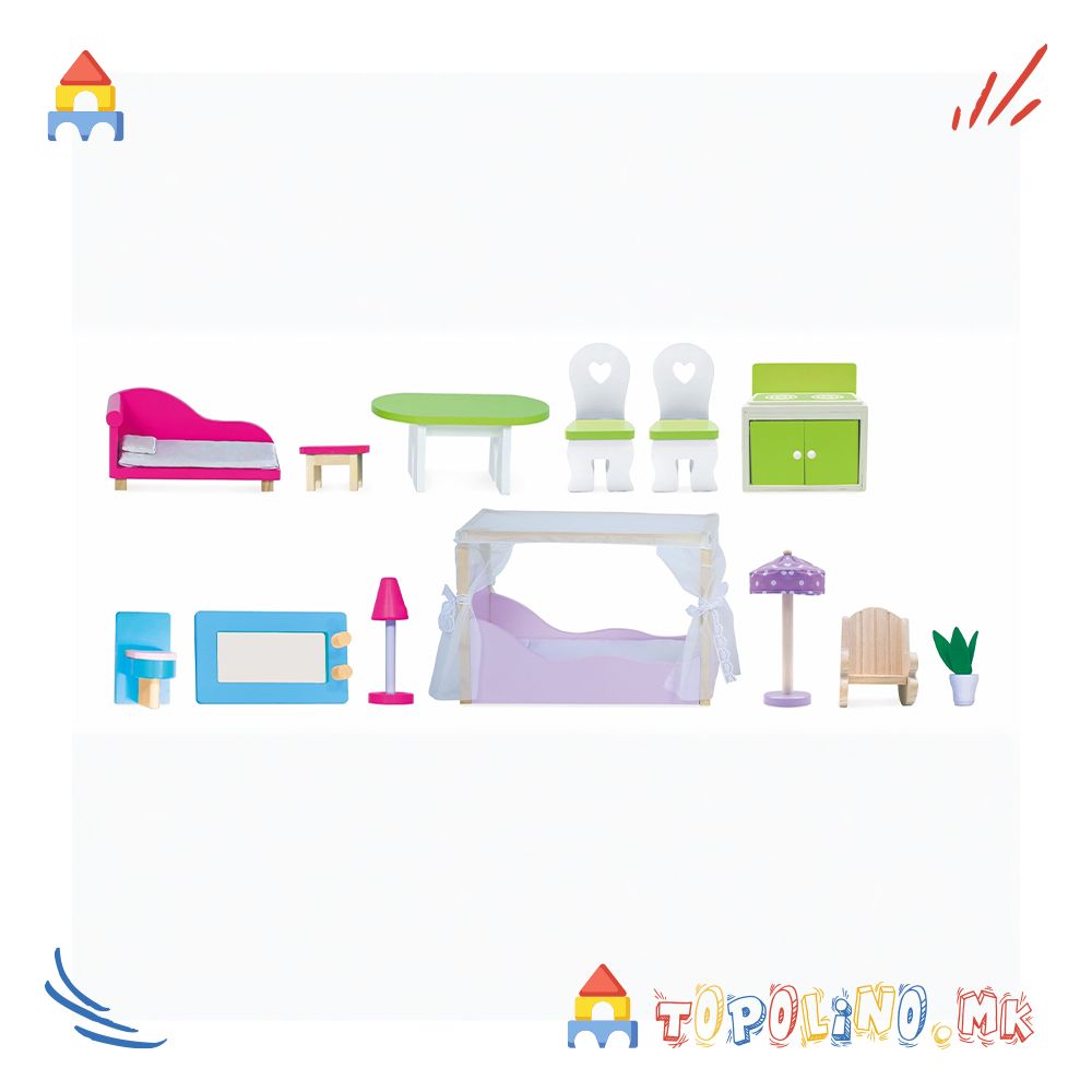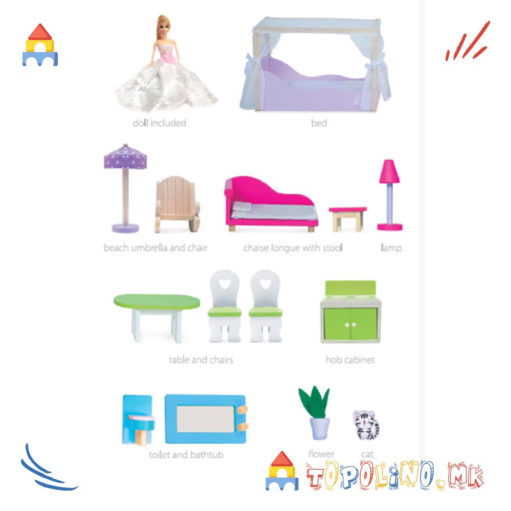 Дрвена куклена куќа, која вклучува кукла во комплетот, заедно со 15 додатоци и мебел.