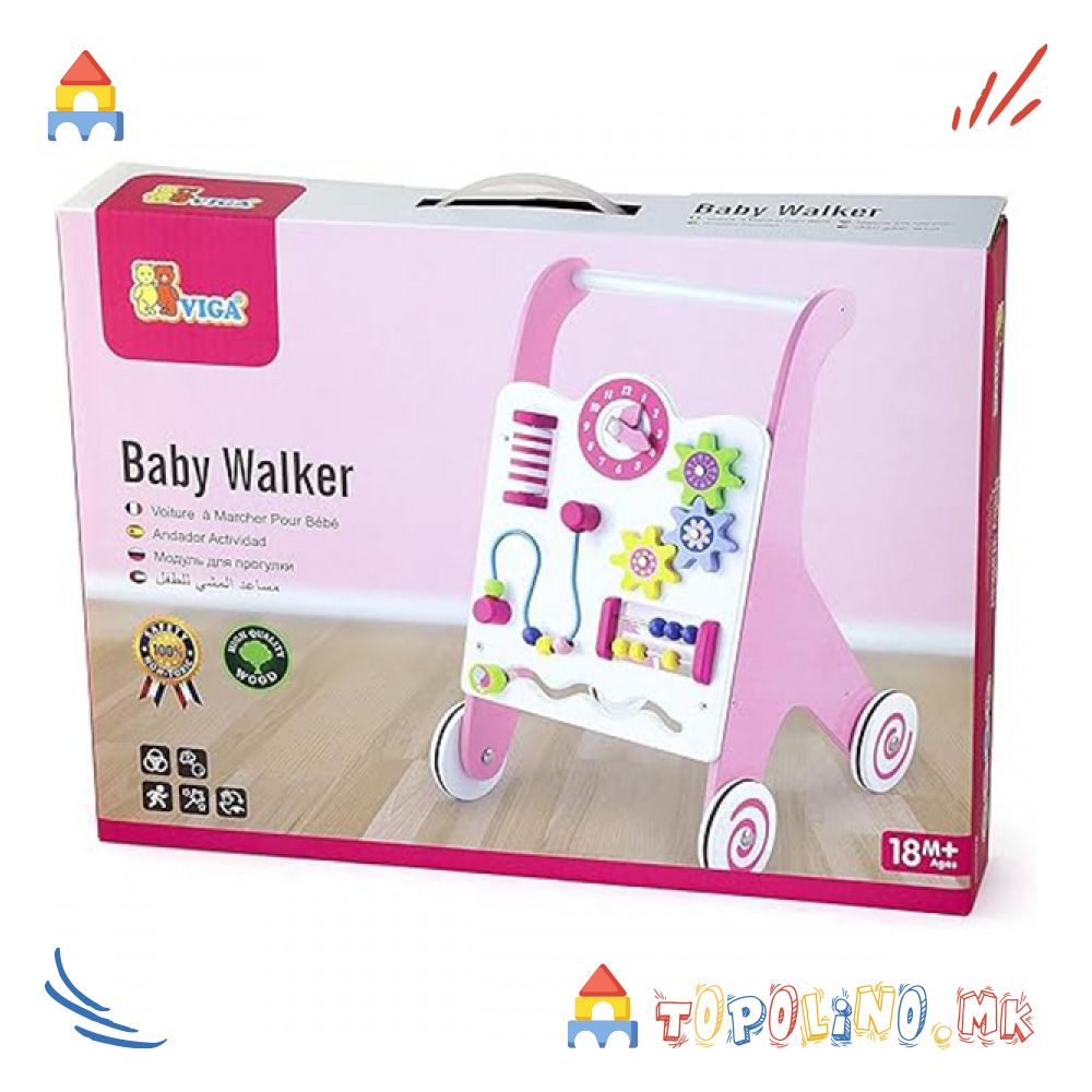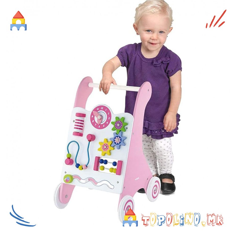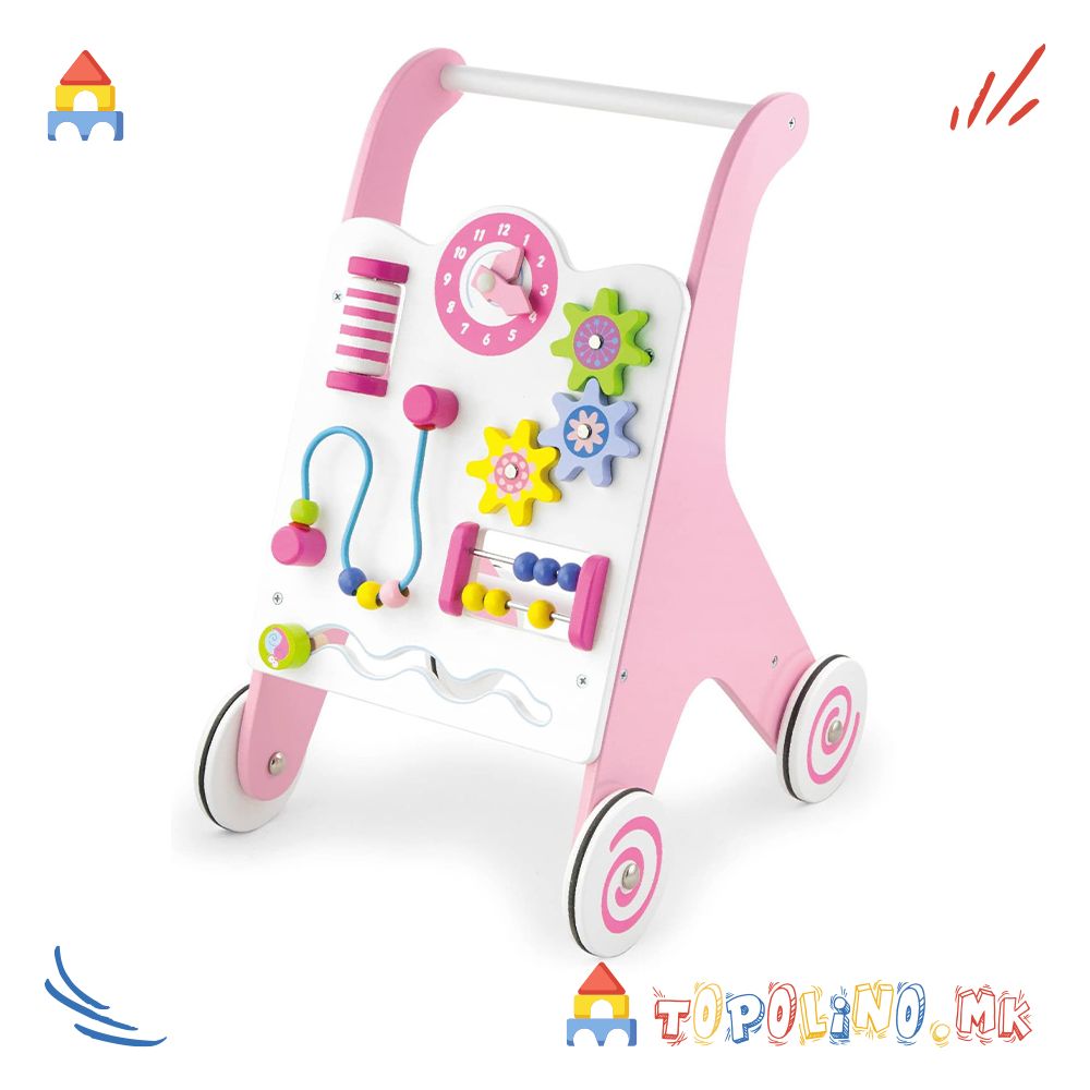 Внимателно дизајниран за најмалите истражувачи. Со стабилна дрвена конструкција и удобна рачка за држење, им овозможува на децата безбедно да ги прават првите чекори. Предниот панел е вистинска мала училница — нуди активности што поттикнуваат моторика, логика и креативност.