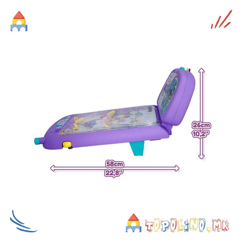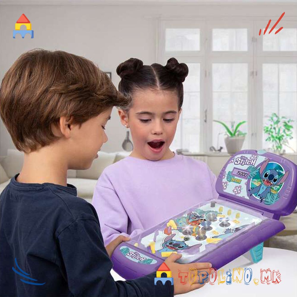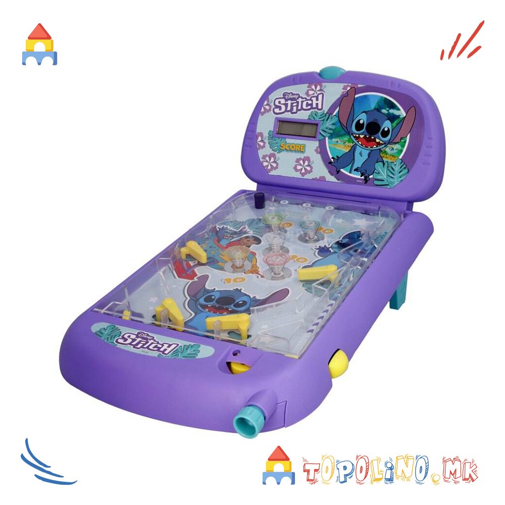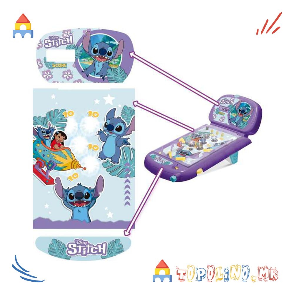 Stitch Super Pinball е пренослива верзија на класичната аркадна игра. Користете ги лопатките за да ја удирате топката во браниците и држете ја во движење што е можно подолго за да освоите повеќе поени. Играјте сами или предизвикајте пријател да го достигне највисокиот резултат. Играта вклучува звуци и светла за уште подобро аркадно искуство. Потребни се 3 LR6 (AA) 1.5V батерии (не се вклучени). Погодно за деца од 3 години.