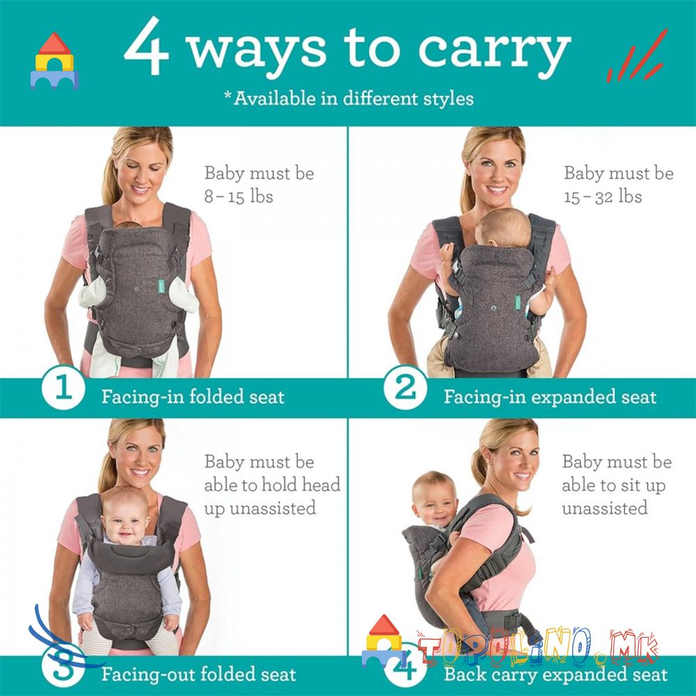 Infantino Flip 4-во-1 носилка за бебиња, од 8-32 кг. Достапна во повеќе шик и стилски бои.