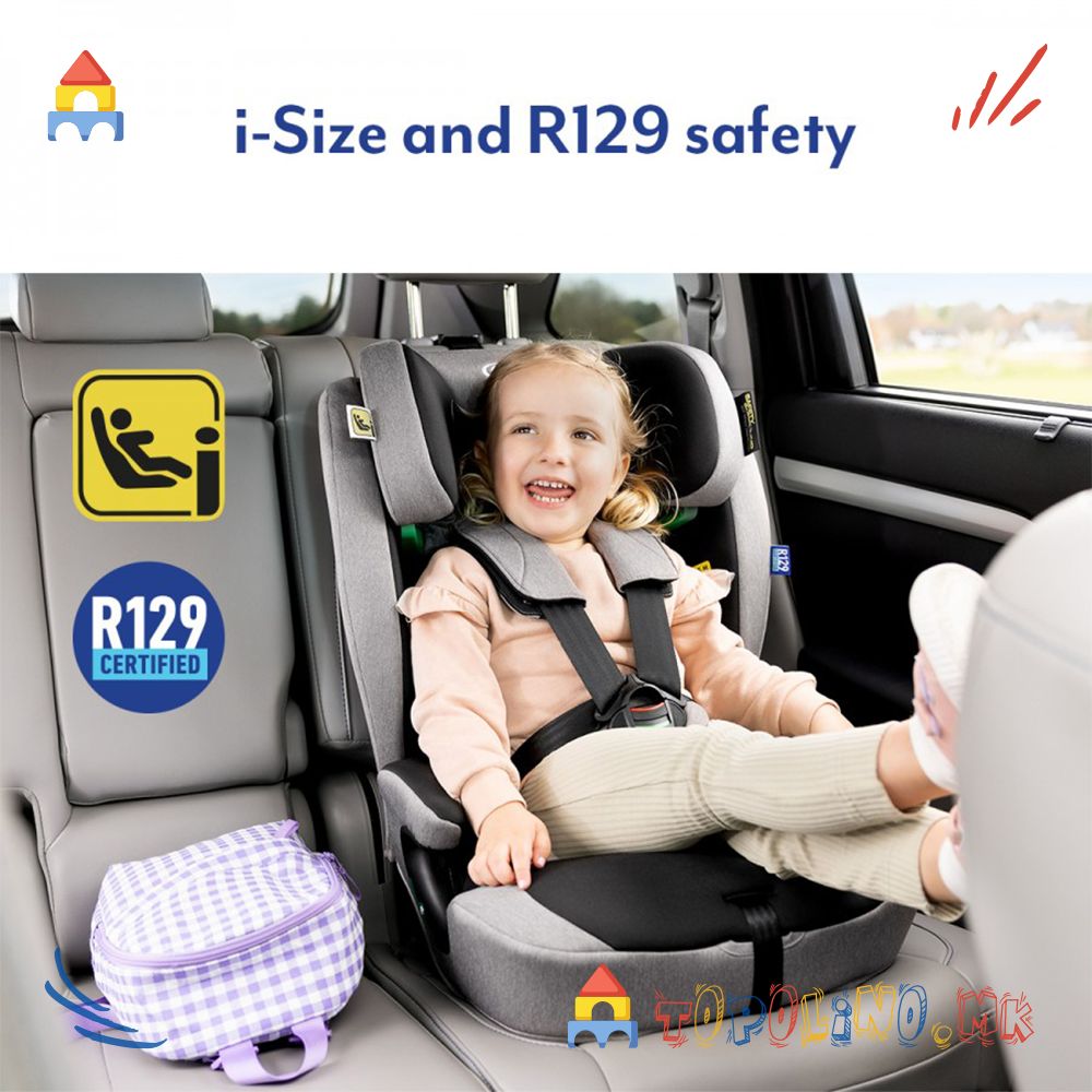 Сертифицирано според i-Size и R129 стандарди во двата режими