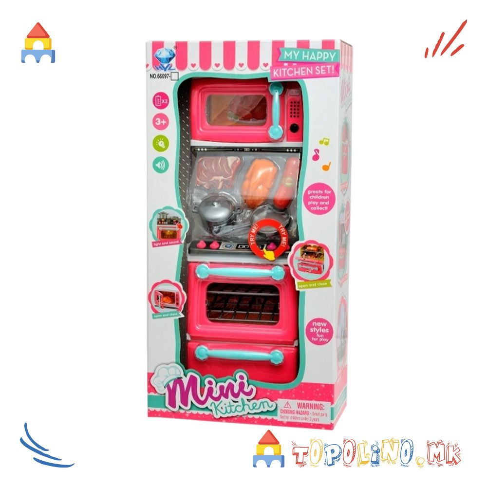 Рерната има звучни и светлосни ефекти. Доаѓа со додатоци за готвење. Отворете ја микробрановата и рерната за да ги зготвите најубавите јадења. Потребни се 2 ААА батерии кои не се вклучени во сетот. Соодветно за деца над 3 години.