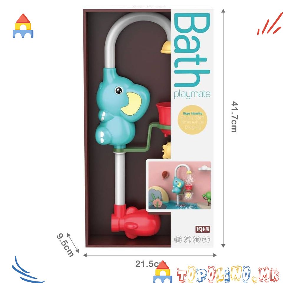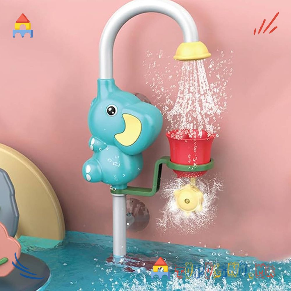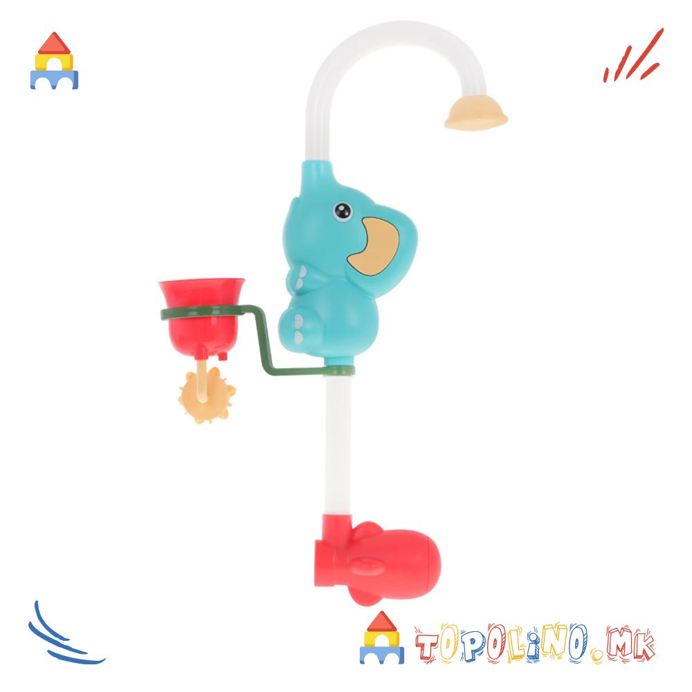 Благодарение на едноставен механизам, најмалите можат самостојно да пумпаат вода со притискање на увото на слонот. По еден момент, водата ќе почне да тече низ сурлата на слонот. Децата можат да ја стават вклучената чаша со дупки под туш-капата. Ротирачко тркало под чашата ја распределува водата во различни насоки, обезбедувајќи дополнителна забава при капење.