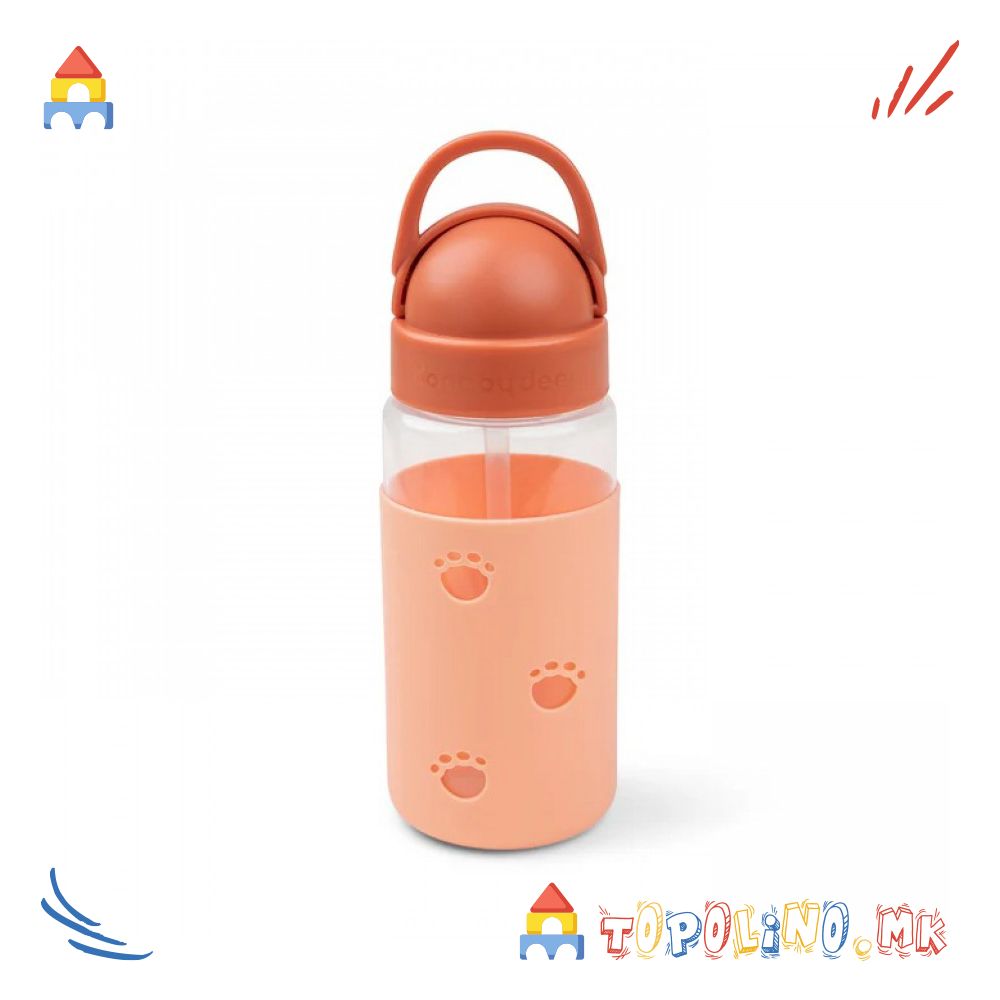 Нелизгавото шише за пиење е незаменлив придружник во движење, правејќи ја хидратацијата повесела и поудобна. Силиконската обвивка обезбедува стабилен стисок. Во пакувањето се вклучени дополнителна цевка. Силиконската обвивка е украсена со рељефен Елфи и симпатични отвори во форма на негови стапалки. Топлите папаја тонови го украсуваат шишето, внесувајќи свежина и елеганција.