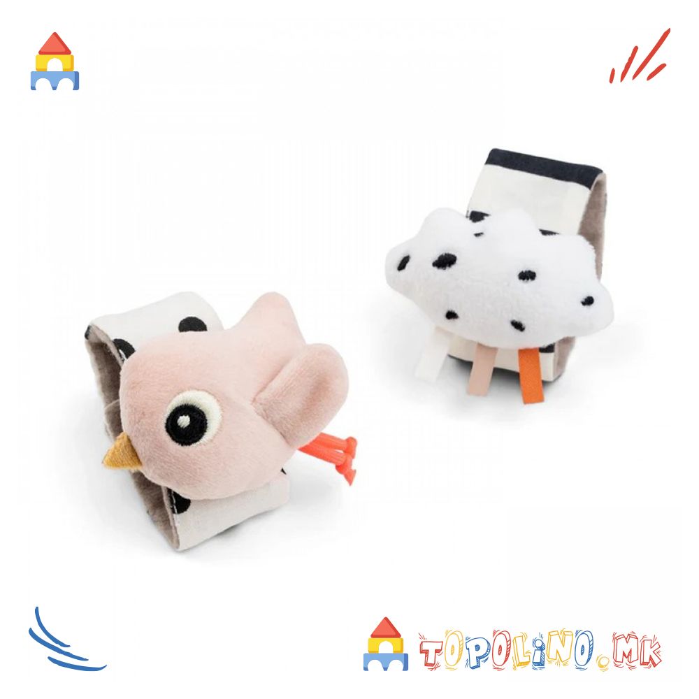 Едната алка е украсена со точки и симпатичното птичe Birdee во пудра нијанса, додека другата има линии и облаче. Благодарение на велкро затворањето, лесно се ставаат и вадат, а можат да се користат и на рачиња и на ножиња. Овој разигран и прилагодлив додаток го збогатува сетилното искуство на вашето бебе и е создаден за развојни активности.