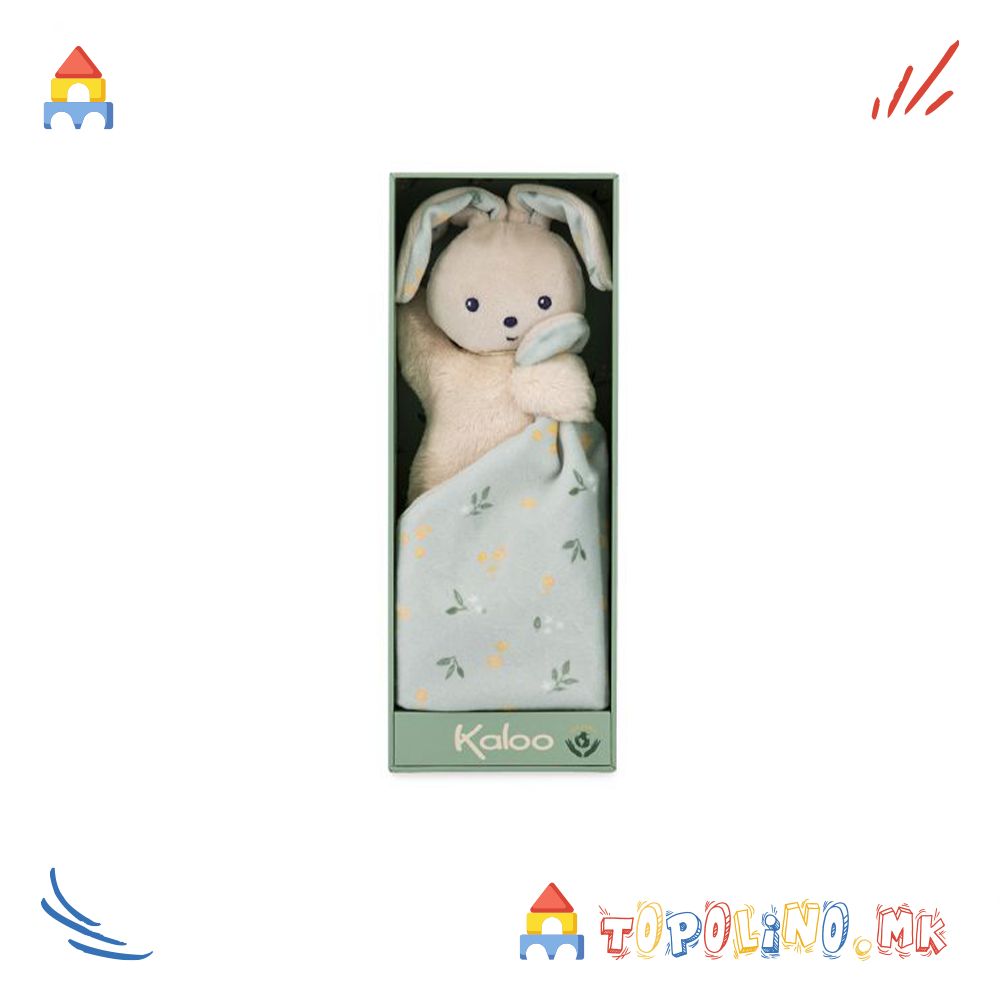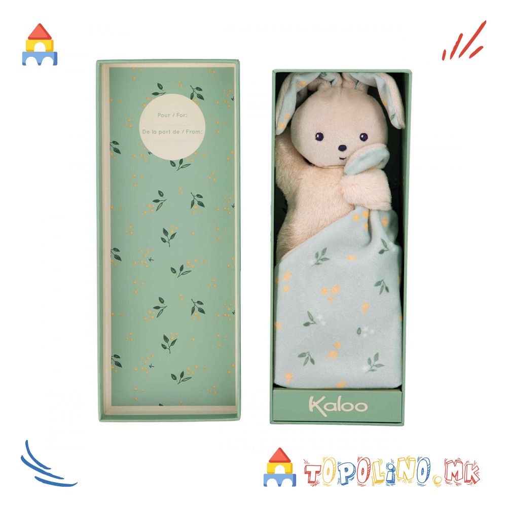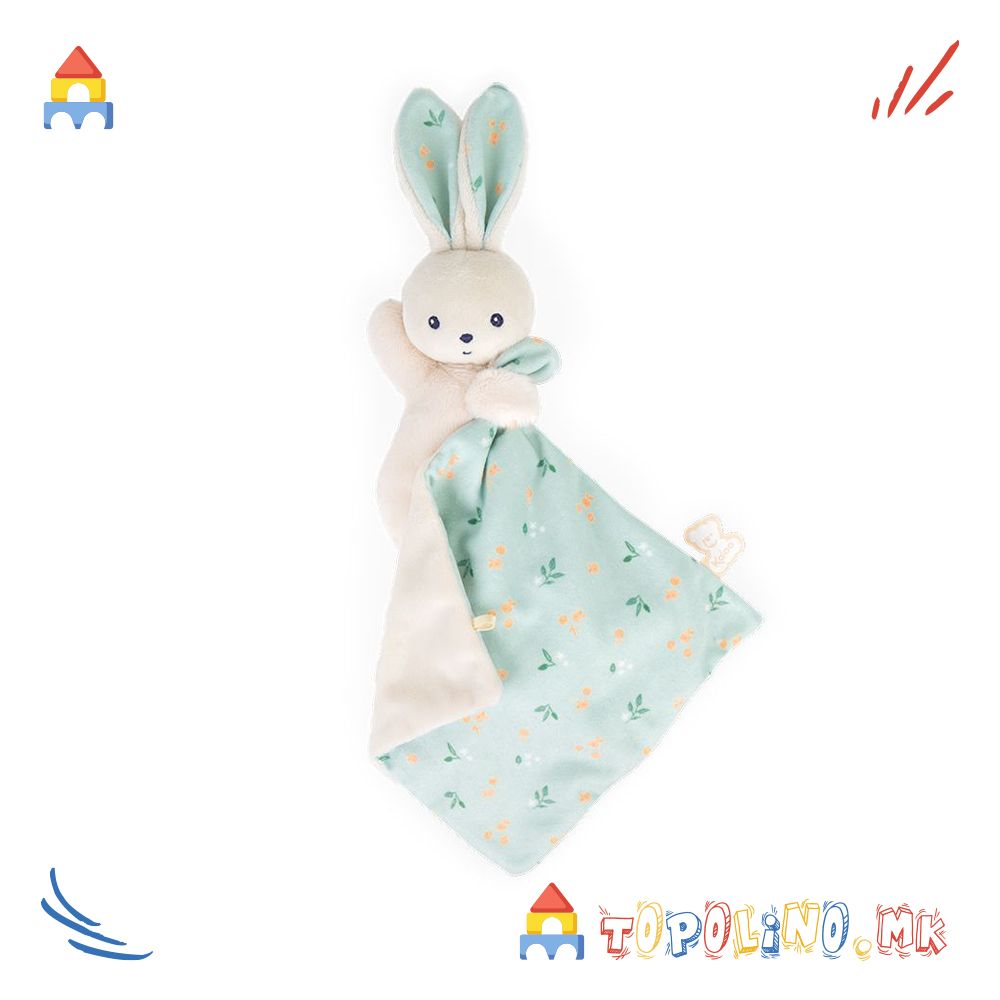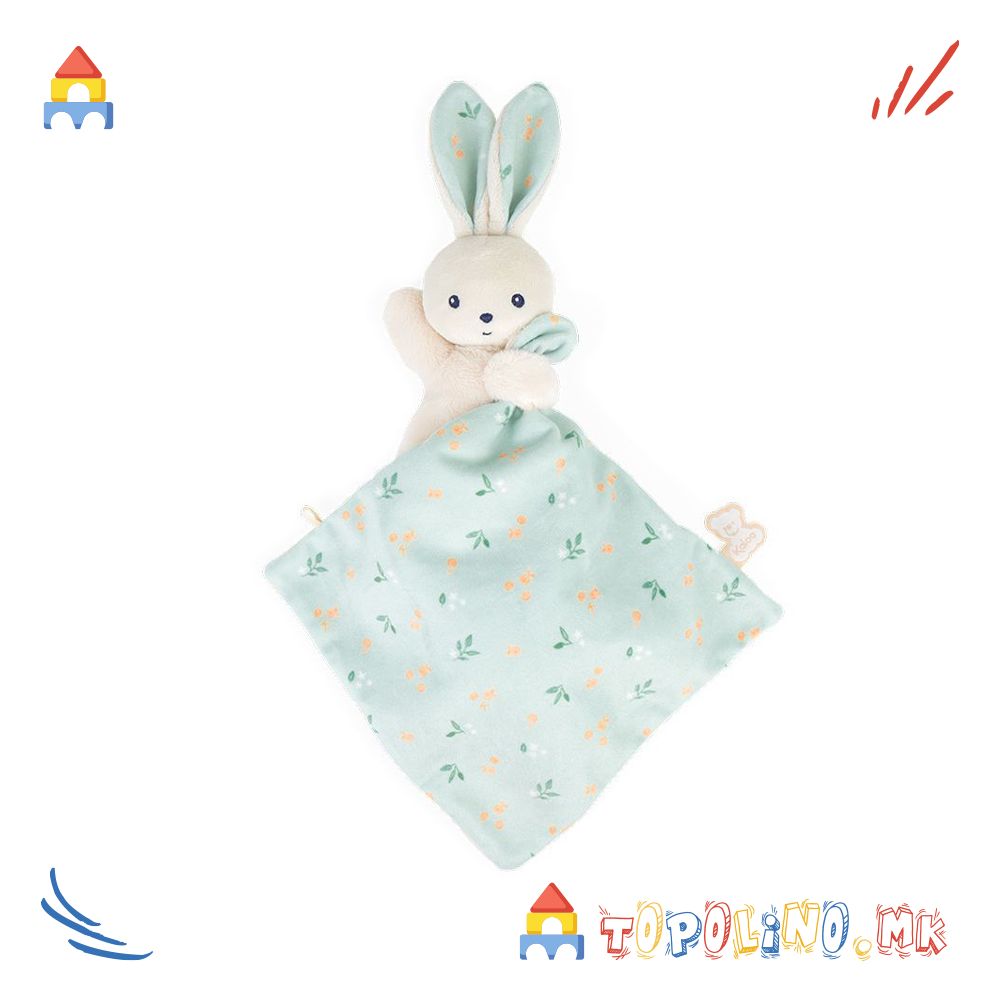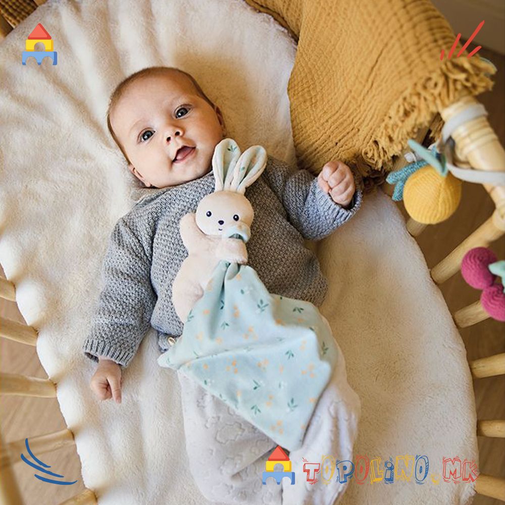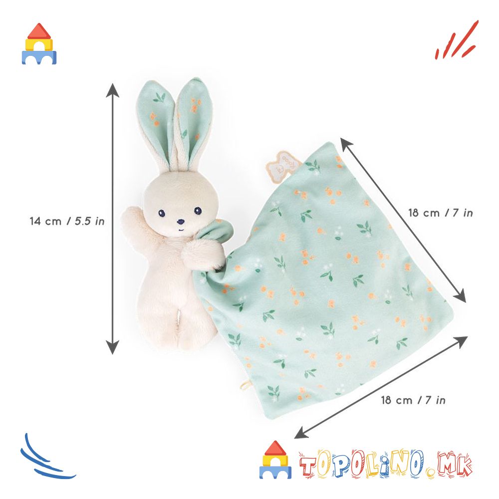 Ова зајче обвиткано во мек мтеријал ќе биде омилен придружник на бебето. Со своето мало меко микро-кадифено тело, зајакот е лесен за фаќање и држење за своето тело или за своите долги уши. Малото зајче држи меѓу шепите ќебе обоено со златни лимони и други рурални детали. Овој нежен и поетски принт се наоѓа во ушите на зајакот и го надополнува целото. Презентирано во прекрасна кутија што може повторно да се употреби како кутија за складирање.