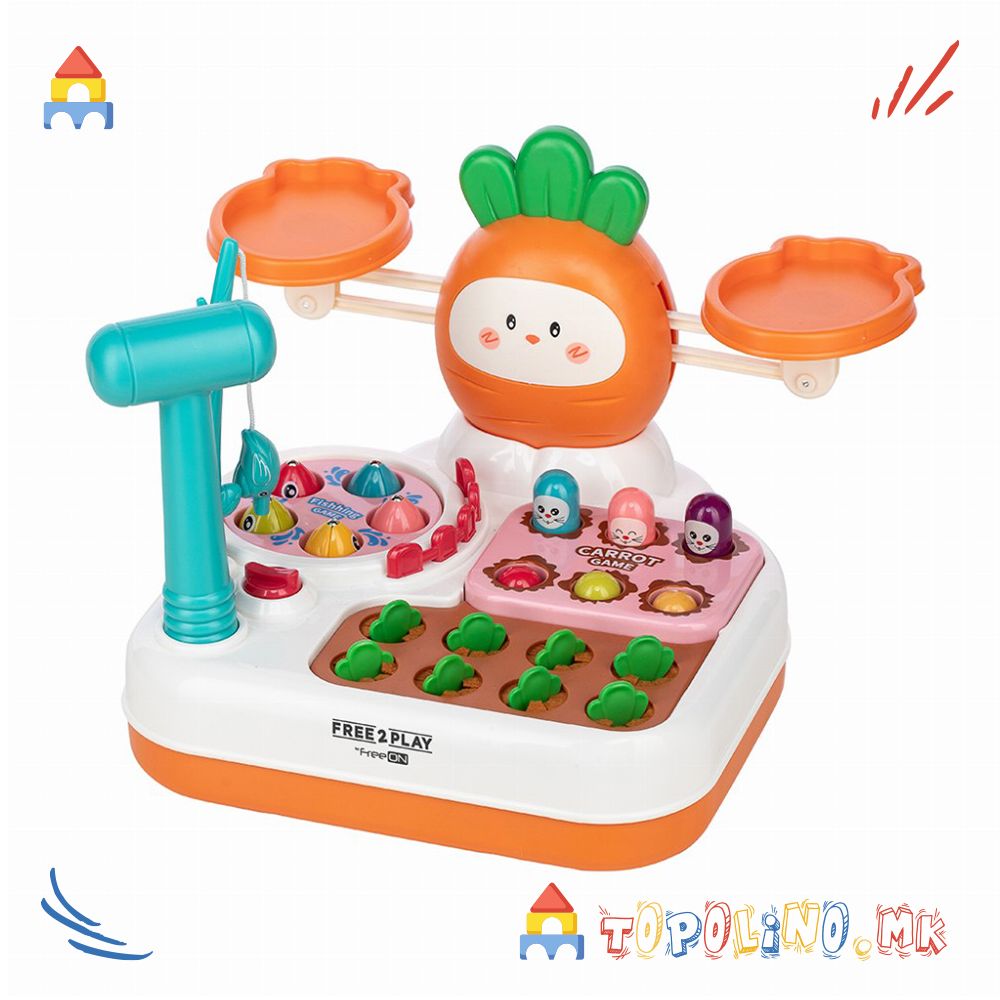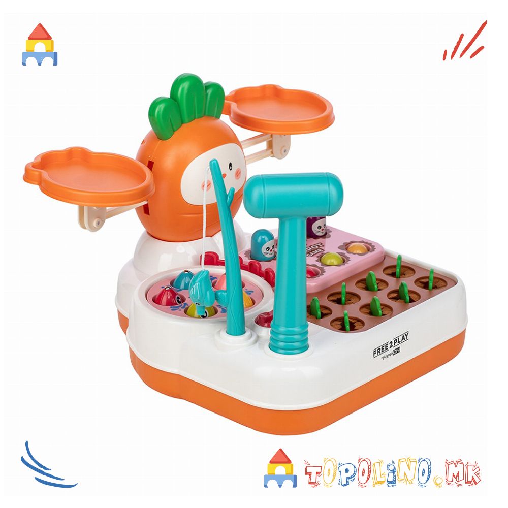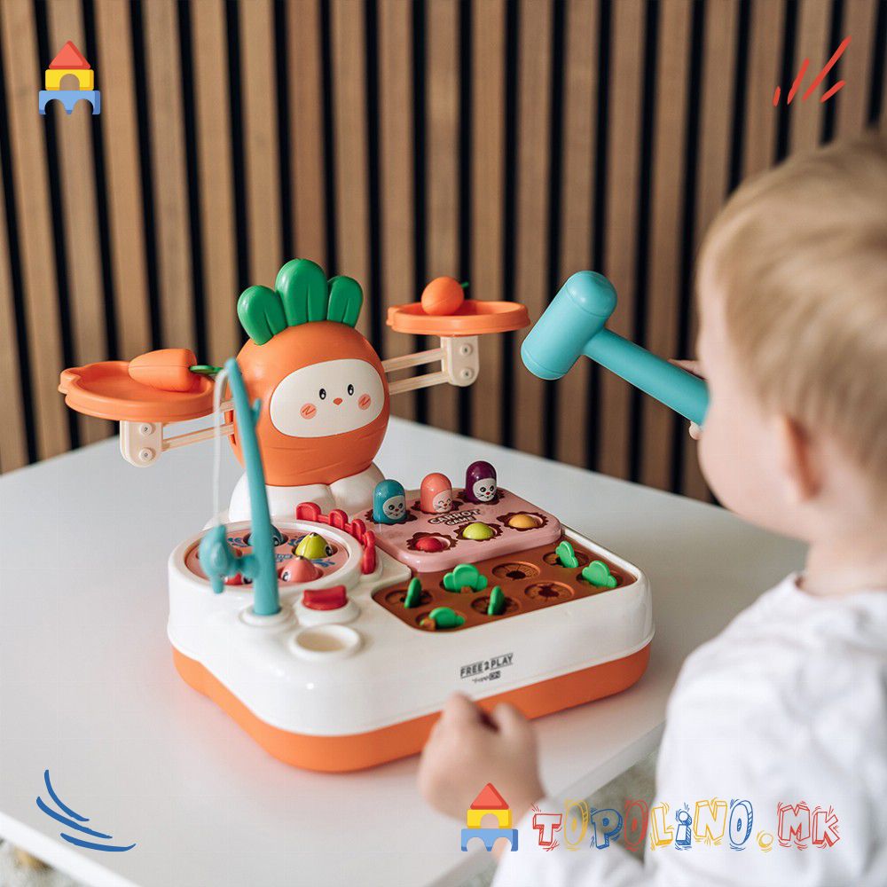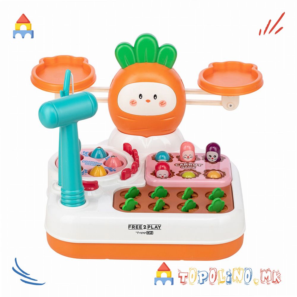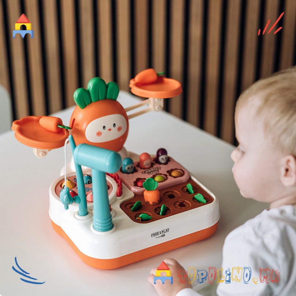 Free2Play Fun Carrot вклучува четири интересни активности во една играчка. Децата можат да одат на риболов, да удираат кртови, да сортираат и вметнуваат моркови и да мерат предмети на вага. Овие игри го поттикнуваат развојот на фини моторни вештини, координација око-рака и логичко размислување.