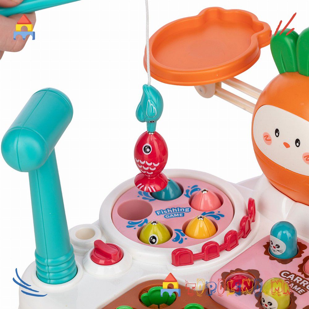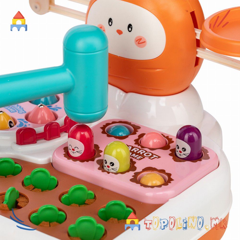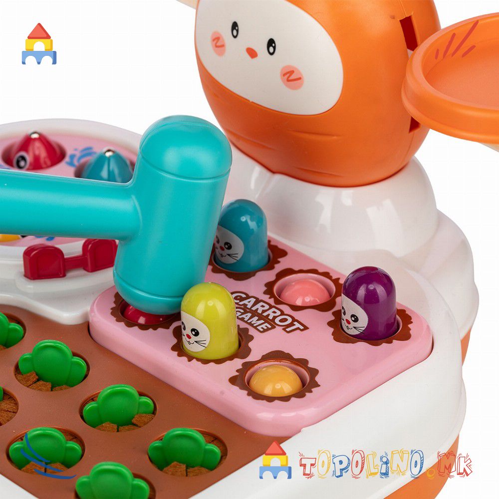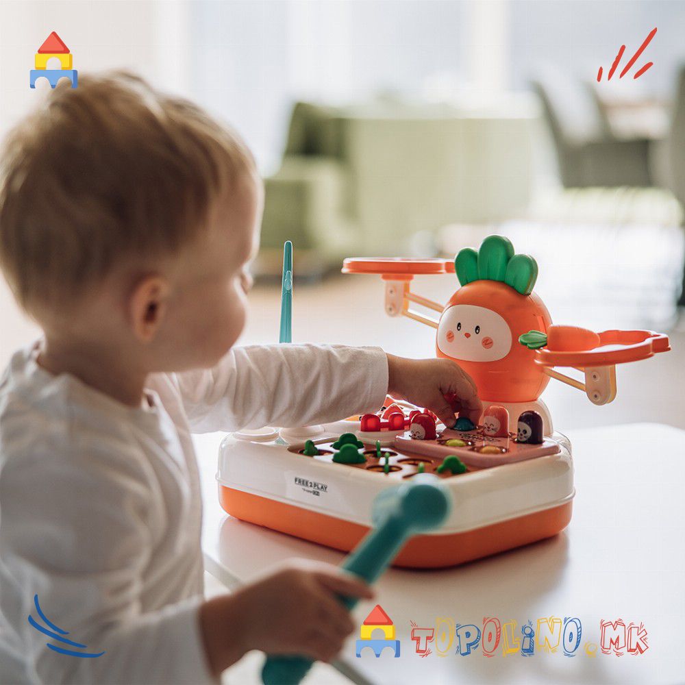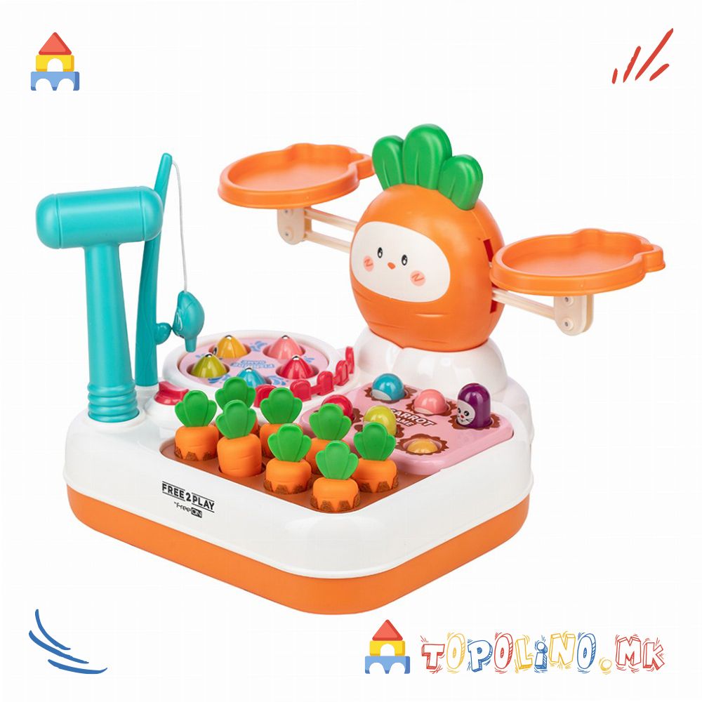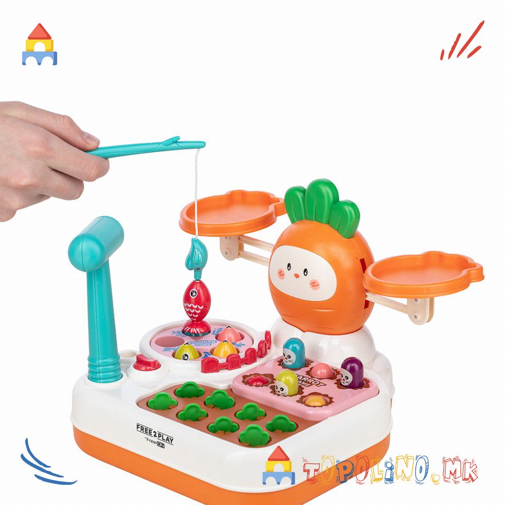 Free2Play Fun Carrot вклучува четири интересни активности во една играчка. Децата можат да одат на риболов, да удираат кртови, да сортираат и вметнуваат моркови и да мерат предмети на вага. Овие игри го поттикнуваат развојот на фини моторни вештини, координација око-рака и логичко размислување.